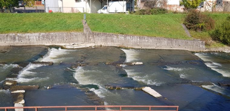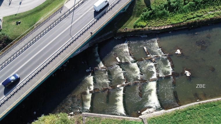 A structure consists of a two-step concrete weir damming water to the height of 1,1 m and located 14 m away from a concrete diaphragm wall leveled with bottom. Due to its significant height, the weir does not allow for a free fish migration. River banks on the whole stretch between the weir and the diaphragm wall are strengthened by retaining walls. The technical state of the existing device is poor.