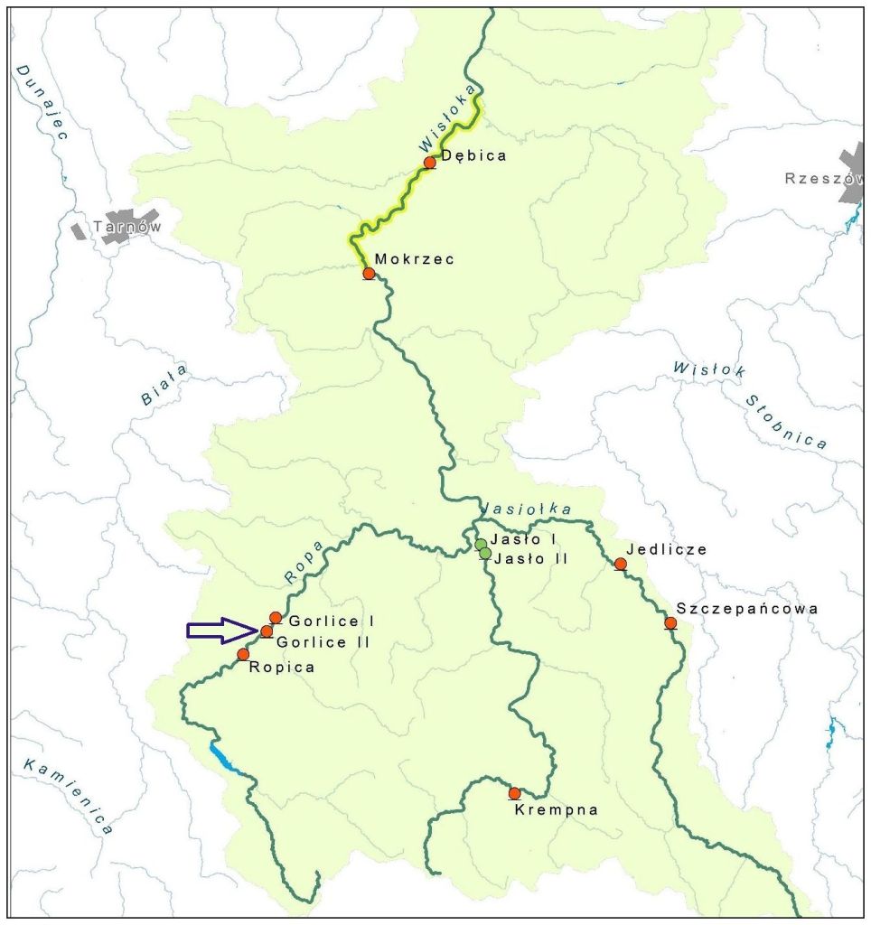 Zbudowany w centrum Gorlic betonowy jaz stabilizuje koryto Ropy dla różnych celów: w pobliżu znajdują się dwa mosty (droga krajowa nr 28 i droga wojewódzka nr 977) oraz dwa przejścia kanalizacji – deszczowej i sanitarnej. Piętrzy on wodę dość wysoko, bo do 1,1 m, a zbudowane z głazów bystrze poniżej jazu uniemożliwia swobodną migrację ryb z powodu zbyt dużych prędkości płynącej tam wody.