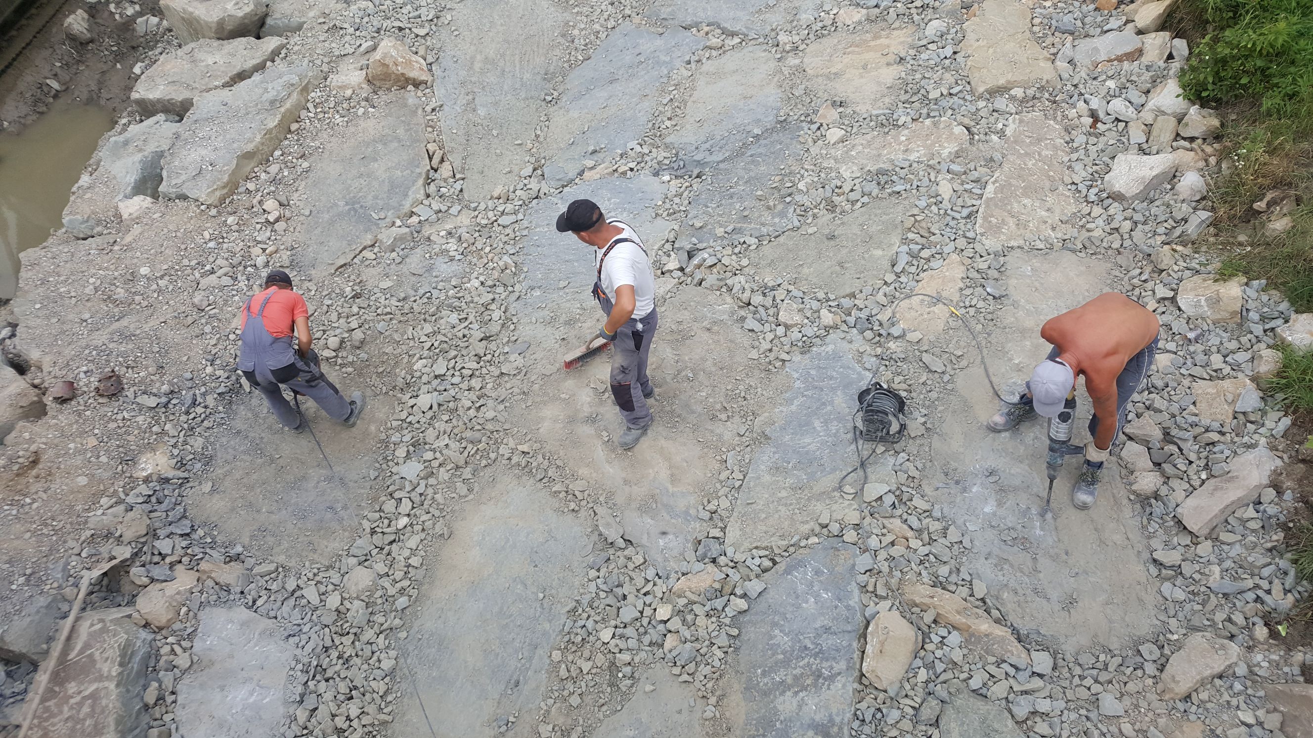 - zamiany płyty żelbetowej na pogrubiony kamienny pancerz dna, ograniczony pionowymi ścianami kamiennymi i układany na dwukierunkowej geosiatce w obsypce rumoszem skalnym,