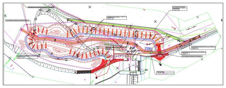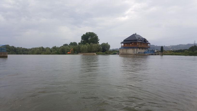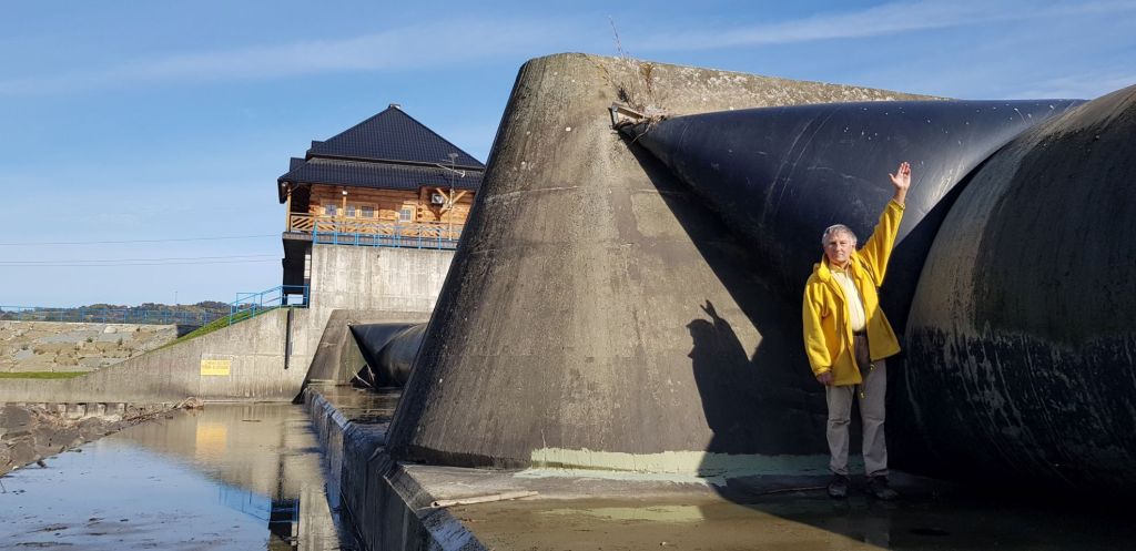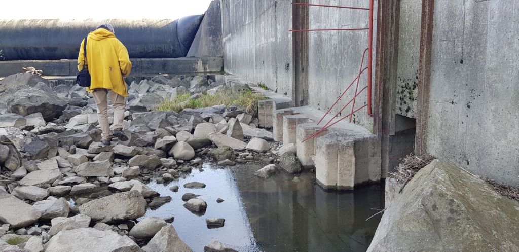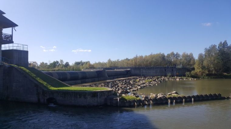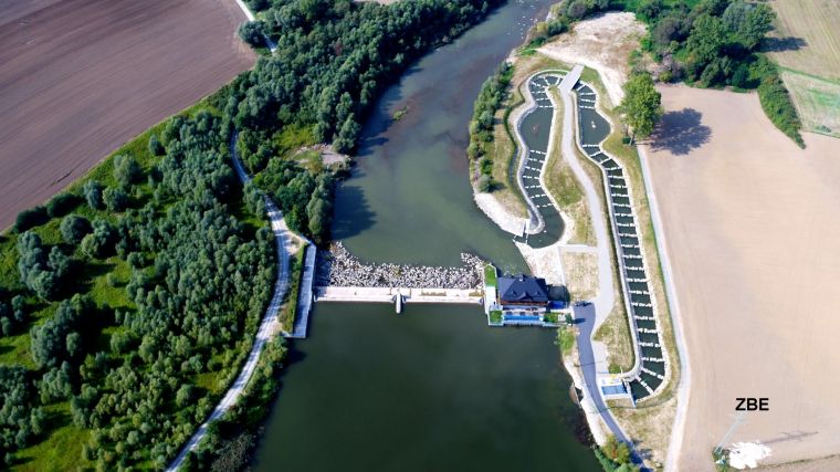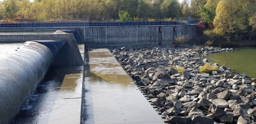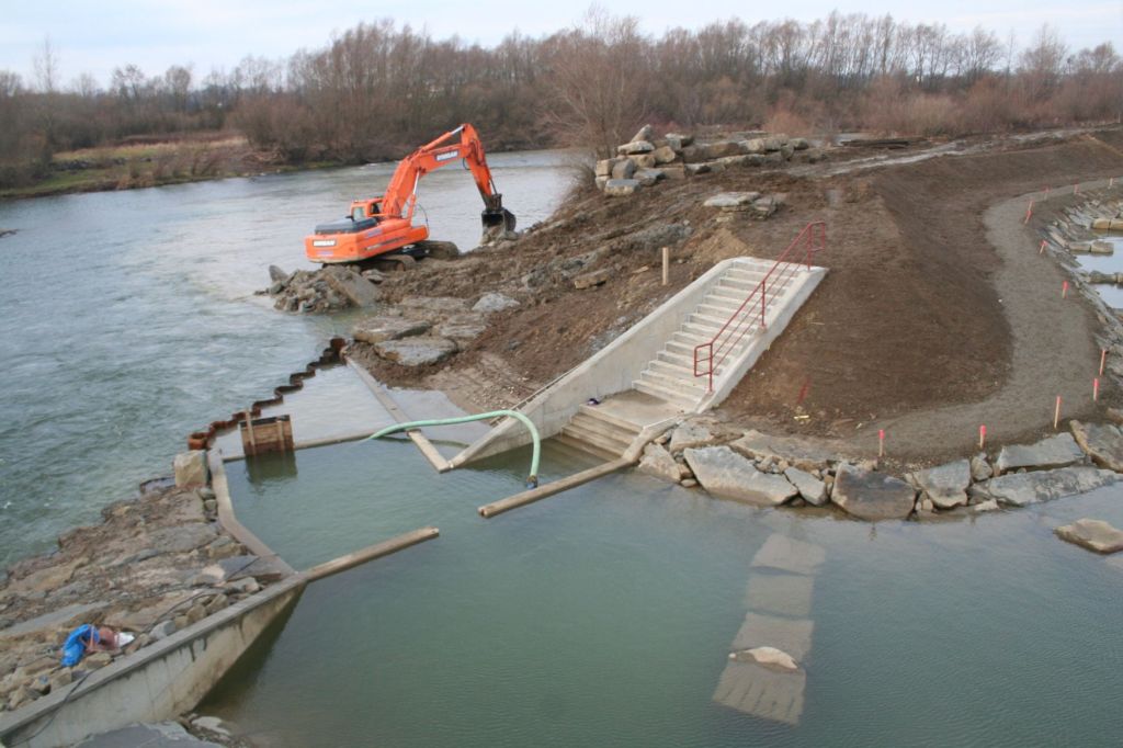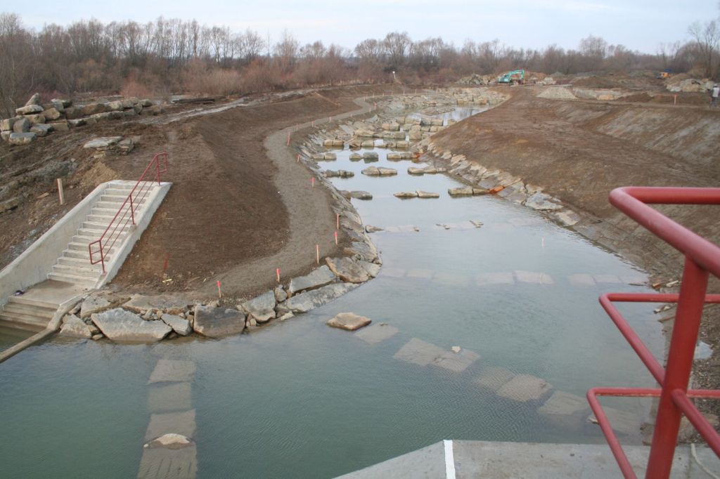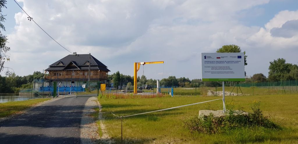 (przepławka prawie skończona – brakuje około 80 m do połączenia z budynkiem na monitoring powyżej jazu)