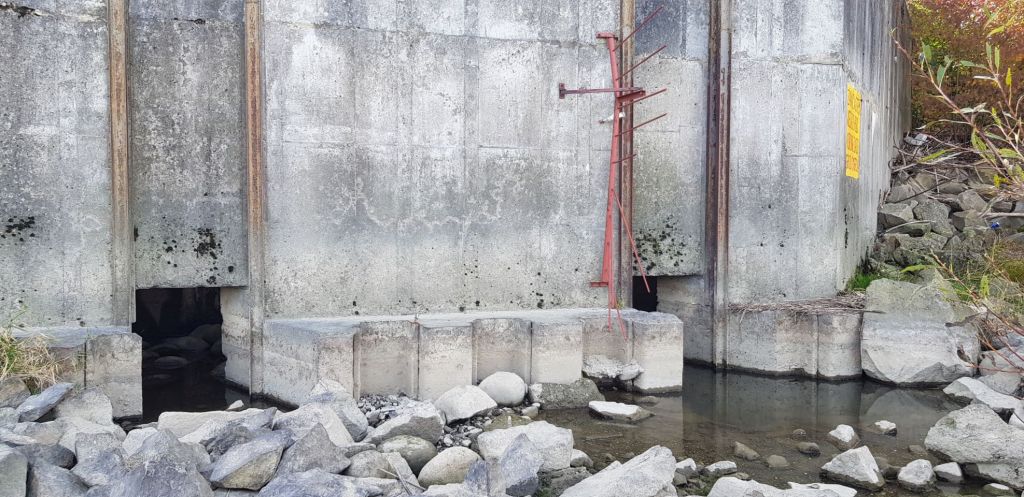 W celu łagodnego wyjścia ryb do zbiornika zaprojektowano ubezpieczenie dna narzutem kamiennym Dmin = 0,5 m na długości ok. 6 m. Wylot z przepławki od strony wody dolnej składać się będzie z doku żelbetowego o szerokości 4,0 m wraz ze skrzydłami. W żłobie zaprojektowano dwie przegrody żelbetowe ze szczeliną o szerokości 1,0 m. W celu zwiększenia szorstkości dna i polepszenia warunków migracyjnych ryb w dno zostanie wmurowany narzut kamienny o Dmin = 0,2 m.