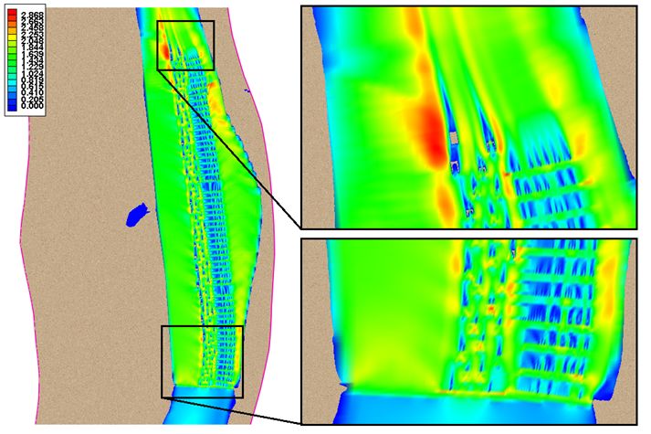 Dla przykładu, koryto przepławki w Ropicy Polskiej zostało przez nas podzielone na dwa odrębne kanały, które mają służyć różnym wielkościom ryb. Jeden z nich, z głazami w formie szachownicy jest przeznaczony dla gatunków większych – dobrze pływających, a drugi w formie rygli dla wszystkich mniejszych, pływających słabiej. Wykorzystanie modelu pozwoliło nam dobrać takie ustawienie przegród, że spełnione zostały wymagania dla obu rodzajów ryb.