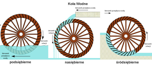 Potem pojawiły się koła wodne. Od średniowiecza napędzały one nie tylko młyny, ale i folusze produkujące sukno, kuźnie oraz inne maszyny np. kowalskie i tartaczne. Na początku wszystko było bardzo proste – wręcz prymitywne. Pierwsze koła były podsiębierne – najprostsze z możliwych. Były to, zawieszone na osi, koła z łopatkami zanurzone częściowo w wodzie. Woda płynąc obracała je i napędzała tym samym żarna lub inne maszyny. Ich sprawność była niewielka, bo wykorzystywały tylko 20% energii, ale w sumie nie przeszkadzały one ani rzece, ani rybom.