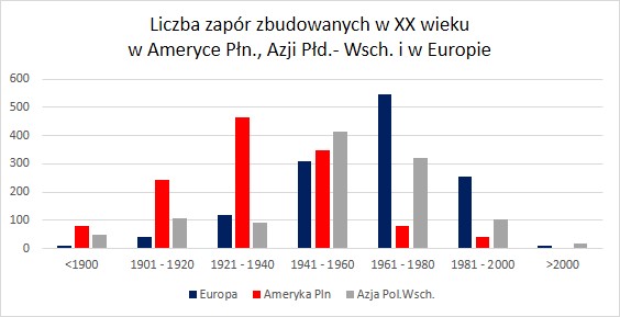 W konsekwencji stare i romantyczne czasy młynów, foluszy i tartaków napędzanych przez rzeki minęły i rozpoczęła się w XIX w niemal przemysłowa „produkcja” małych, dużych i wielkich przegród na rzekach. Jej szczyt miał miejsce w Europie drugiej połowie wieku XX. Ale Europa była jak zwykle zapóźniona – w Ameryce Północnej (USA, Kanada) ten szczyt przypadł na lata 1920-1940, w Azji południowo-wschodniej (Chiny, Indie, Wietnam, Japonia) w latach 1940-1960, a w Europie w latach 1960-1980[i]. Obrazuje to wykres poniżej.
